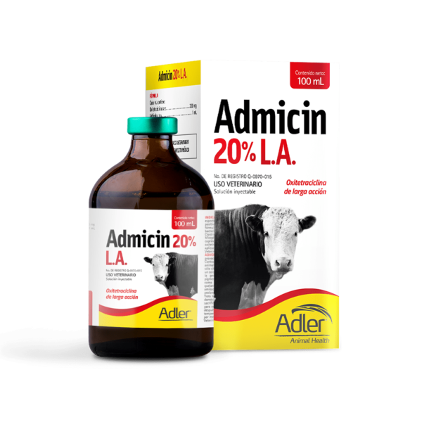 Admicin L.A. 20% es un antibiótico de acción prolongada que contiene oxitetraciclina, diseñado para el tratamiento de infecciones bacterianas graves en bovinos, equinos, porcinos y ovinos. La fórmula de acción prolongada permite que una sola inyección mantenga niveles terapéuticos del medicamento en el organismo por un período extendido, lo que minimiza la necesidad de administraciones repetidas. Este antibiótico es ideal para tratar enfermedades bacterianas que afectan el tracto respiratorio, digestivo, urinario y dérmico. Admicin L.A. 20% se recomienda en casos de neumonía, metritis, infecciones uterinas y dermatitis en animales de producción. Su administración intramuscular asegura una liberación lenta y continua del principio activo.